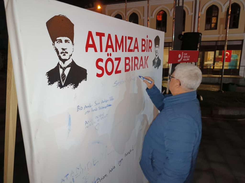 Gecede duygu dolu anlar yaşanırken, CHP’li gençler Ata’sına olan bağlılığını bir kez daha vurguladı. Etkinlik kapsamında anıt alanında oluşturulan panoya vatandaşlar Atatürk’e dair duygu ve düşüncelerini yazdı.