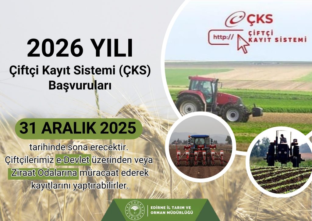 Edirne İl Tarım ve Orman Müdürlüğü, 2026 yılı Çiftçi Kayıt Sistemi (ÇKS) başvurularına ilişkin bilgilendirmede bulundu. Yapılan duyuruda, 2026 üretim yılı için ÇKS başvurularının 31 Aralık 2025 tarihinde sona ereceği hatırlatıldı.