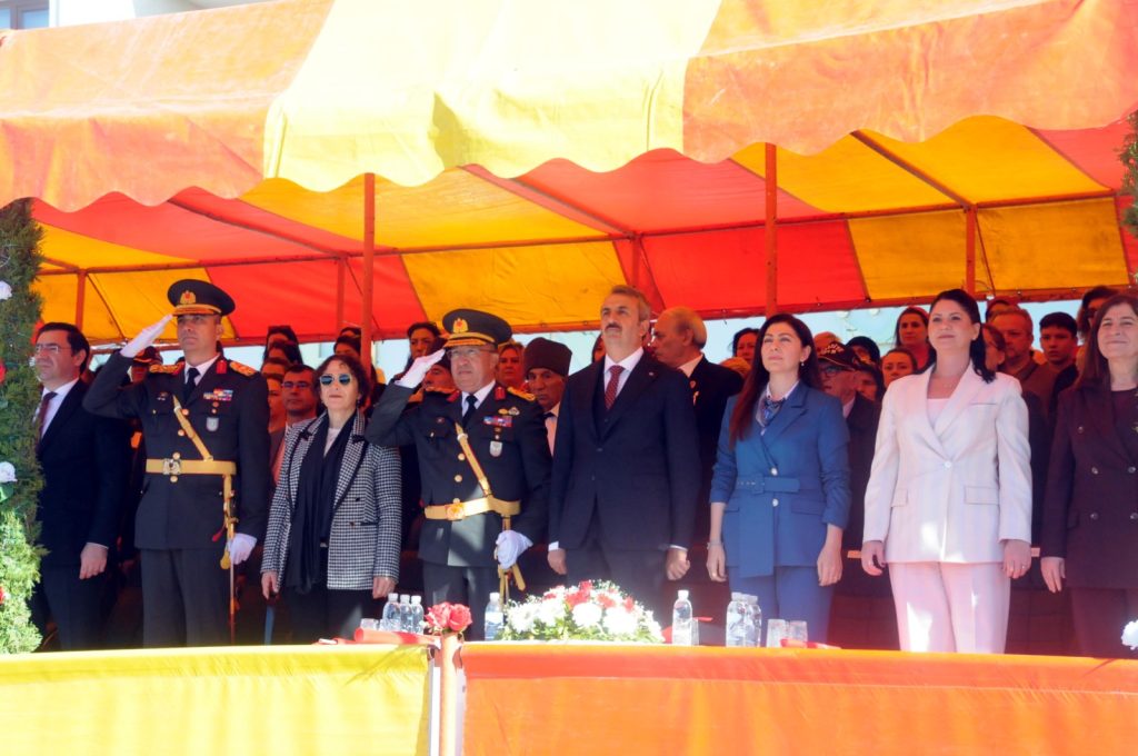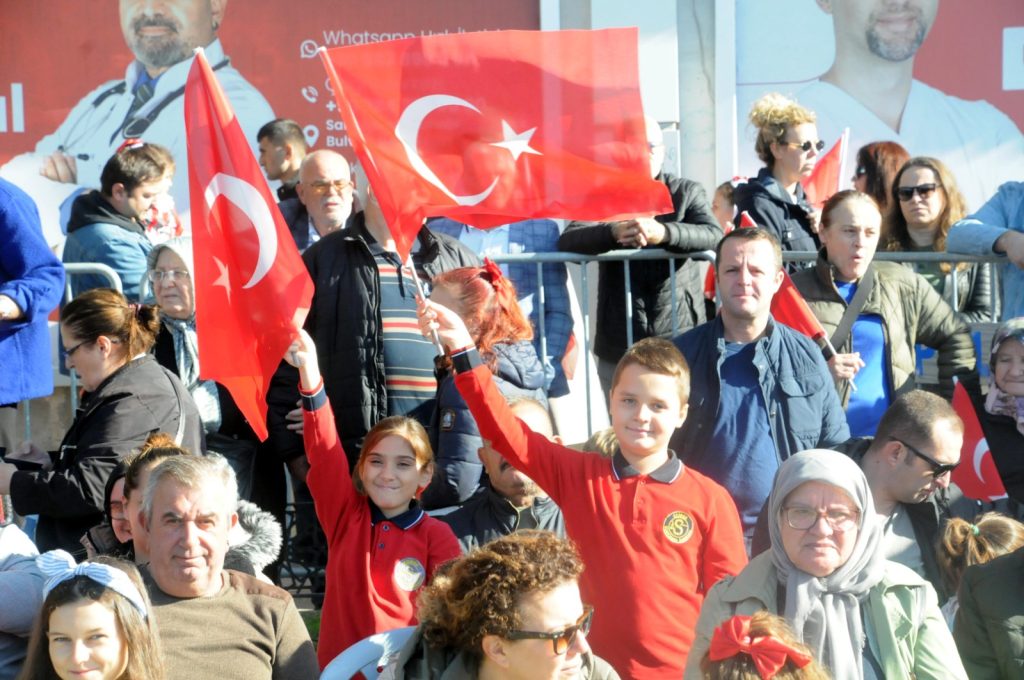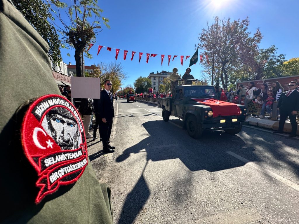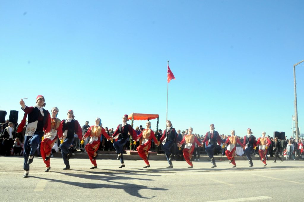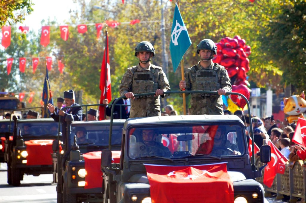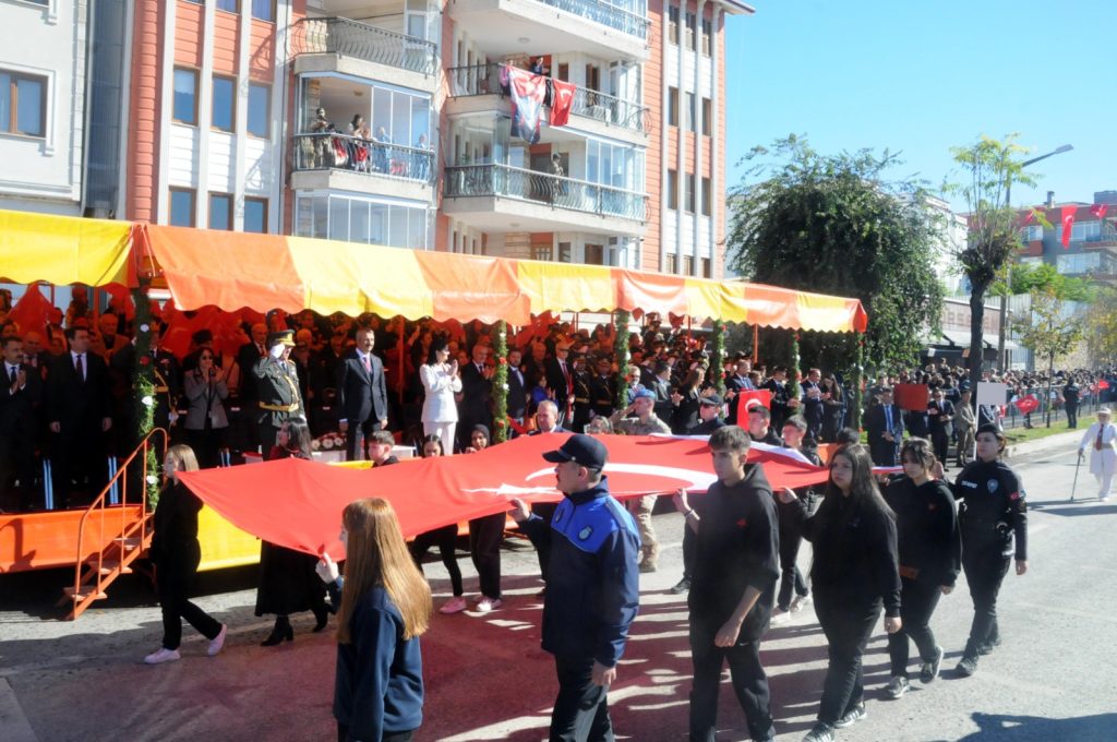 Törende kentteki resmi ve özel okulların yanı sıra 54’üncü Mekanize Piyade Tugay Komutanlığı’na bağlı zırhlı birlikler geçiş yaptı. Vatandaşların yoğun ilgi gösterdiği geçit töreninde, Kara Havacılık Komutanlığı’na bağlı iki helikopter, tören alanı üzerinde gösteri uçuşu gerçekleştirdi. Katılımcılar, helikopterlerin alçak uçuşunu cep telefonlarıyla kaydederek anı ölümsüzleştirdi. Kutlamalar, geçit töreniyle sona erdi.