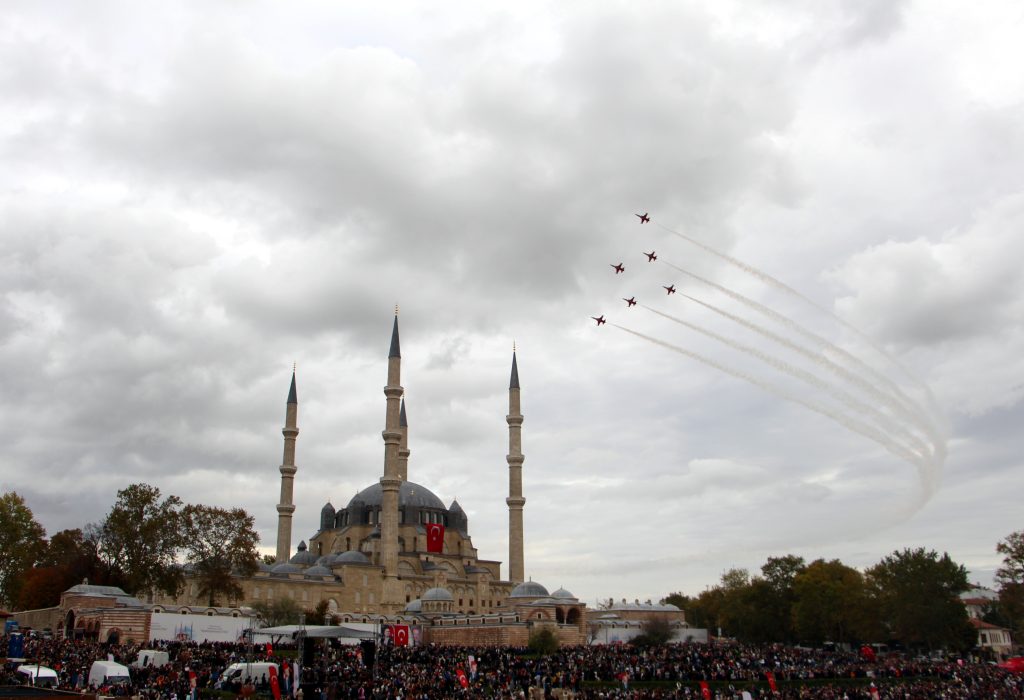 Edirne semalarında Cumhuriyetin 102’nci yılı kutlamaları kapsamında gösteri yapan Türk Yıldızları, Selimiye Camisi’nin gölgesinde binlerce kişiye milli gurur dolu anlar yaşattı.