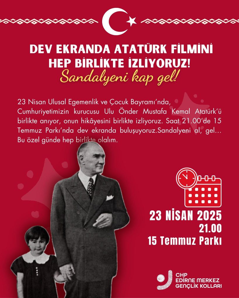 Merkez İlçe Gençlik Kollar tarafından yapılan açıklamada, etkinliğe tüm Edirneliler davet edilerek; “23 Nisan Ulusal Egemenlik ve Çocuk Bayramı’nda, Cumhuriyetimizin kurucusu Ulu Önder Mustafa Kemal Atatürk’ü birlikte anıyor, onun hikâyesini birlikte izliyoruz. Saat 21.00’de 15 Temmuz Parkı’nda dev ekranda buluşuyoruz. Sandalyeni al, gel… Bu özel günde hep birlikte olalım.” denildi.