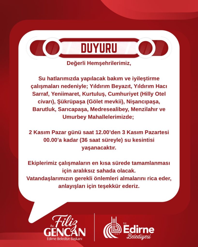 Edirne Belediyesi, Yıldırım Beyazıt, Yıldırım Hacı Sarraf, Yeniimaret, Kurtuluş, Cumhuriyet (Hilly Hotel mevkii), Şükrüpaşa (Gölet mevkii), Nişancıpaşa, Barutluk, Sarıca Paşa, Medrese Alibey, Menzilahir ve Umurbey mahallelerinde, yarın saat 12.00’den itibaren başlamak suretiyle 3 Kasım Pazartesi saat 00.00'e kadar sürecek 36 saatlik su kesintisi yaşanacağını duyurdu.