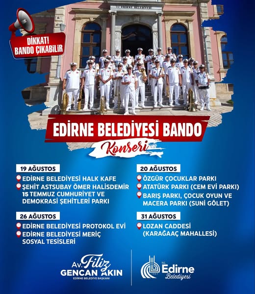Edirne Belediyesi, yaz akşamlarını müzikle renklendirmek için kent genelinde bando konserleri düzenliyor. “Dikkat! Bando çıkabilir” sloganıyla duyurulan etkinlikler, 19, 20, 26 ve 31 Ağustos tarihlerinde şehrin farklı noktalarında Edirnelilerle buluşacak.