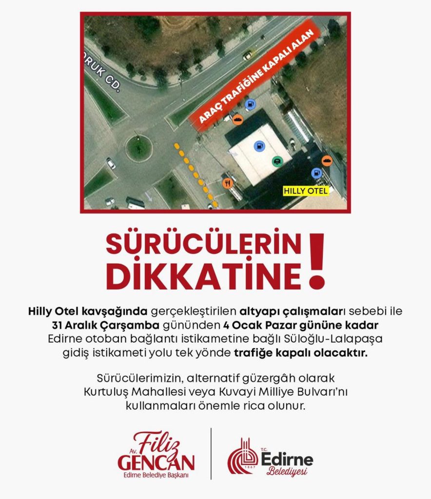 Edirne'nin Hilly Otel Kavşağı’nda altyapı çalışması nedeniyle Edirne Otoban bağlantısı ile Süloğlu–Lalapaşa yönü 31 Aralık–4 Ocak tarihleri arasında tek yönlü trafiğe kapatılacak. Sürücüler Kurtuluş Mahallesi ve Kuvayi Milliye Bulvarı’na yönüne yönlendirilecek.