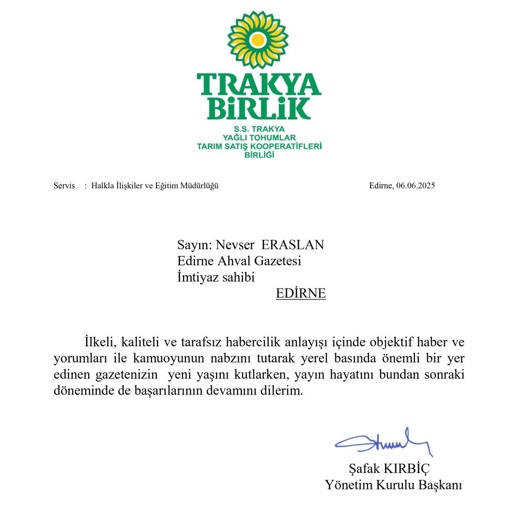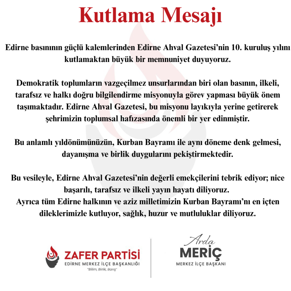 Edirne Ahval Gazetesi bir yılı daha geride bırakarak 10 yaşına girdi. Bağımsızlığımızdan aldığımız güçle devam ettirdiğimiz mesleğimizde, sizlere doğruları yazmaktan vazgeçmeyeceğiz. 6 Haziran 2016 tarihinden bu yana sürdürdüğümüz yayın hayatımızda bizi okuduğunuz ve takip ettiğiniz için tüm okur ve abonelerimize, bu özel günde bizleri yalnız bırakmayarak kutlama mesajlarını ileten herkese teşekkürü bir borç biliriz.