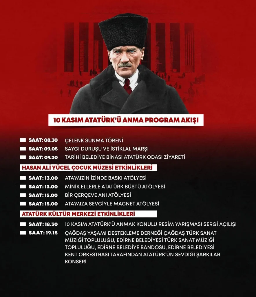 Edirne Belediyesi’nce yapılan duyuruda; “10 Kasım’da bir kez daha Atatürk’ün fikirleriyle aydınlanacak, Cumhuriyet’in ışığıyla parlayacak. Tüm halkımız, bu anlamlı programlara davetlidir” ifadelerine yer verildi. Haber Merkezi