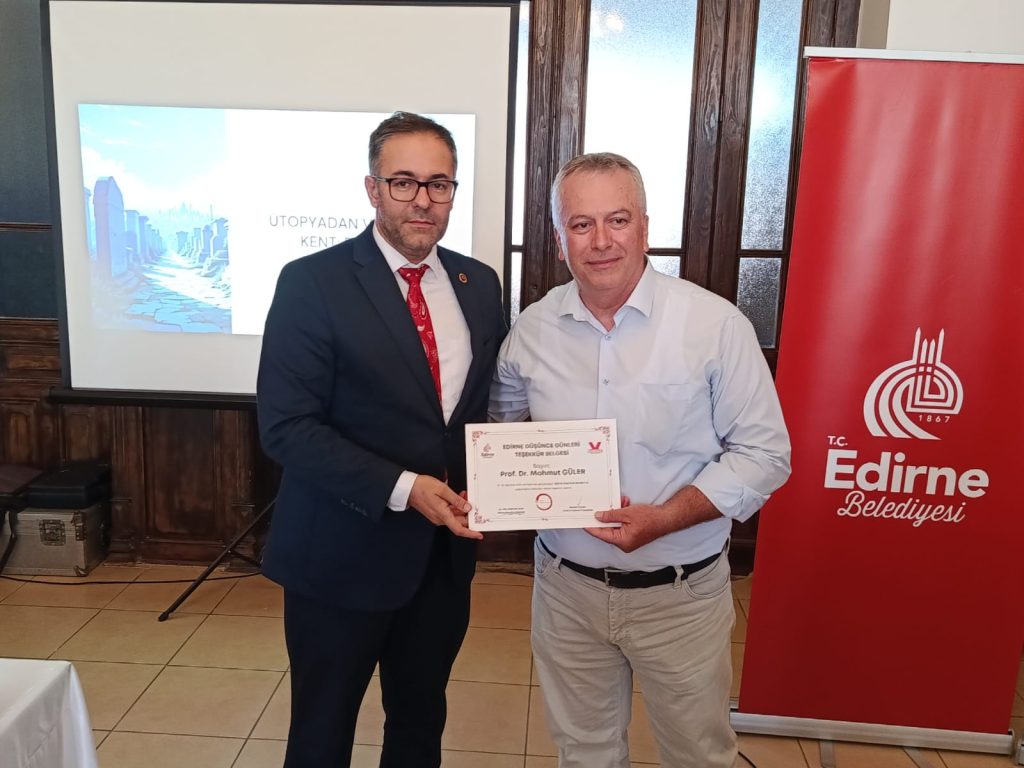 Konuşmaların ardından Belediye Başkan Yardımcısı Cenk Ergüden tarafından, etkinliğin ilk sunumunu gerçekleştiren Prof. Dr. Mahmut Güler’e teşekkür belgesi takdim etti. Açılış Programının ardından Prof. Dr. Güler, “Hayalden Vizyona: Edirne” konulu sunumunu gerçekleştirdi.