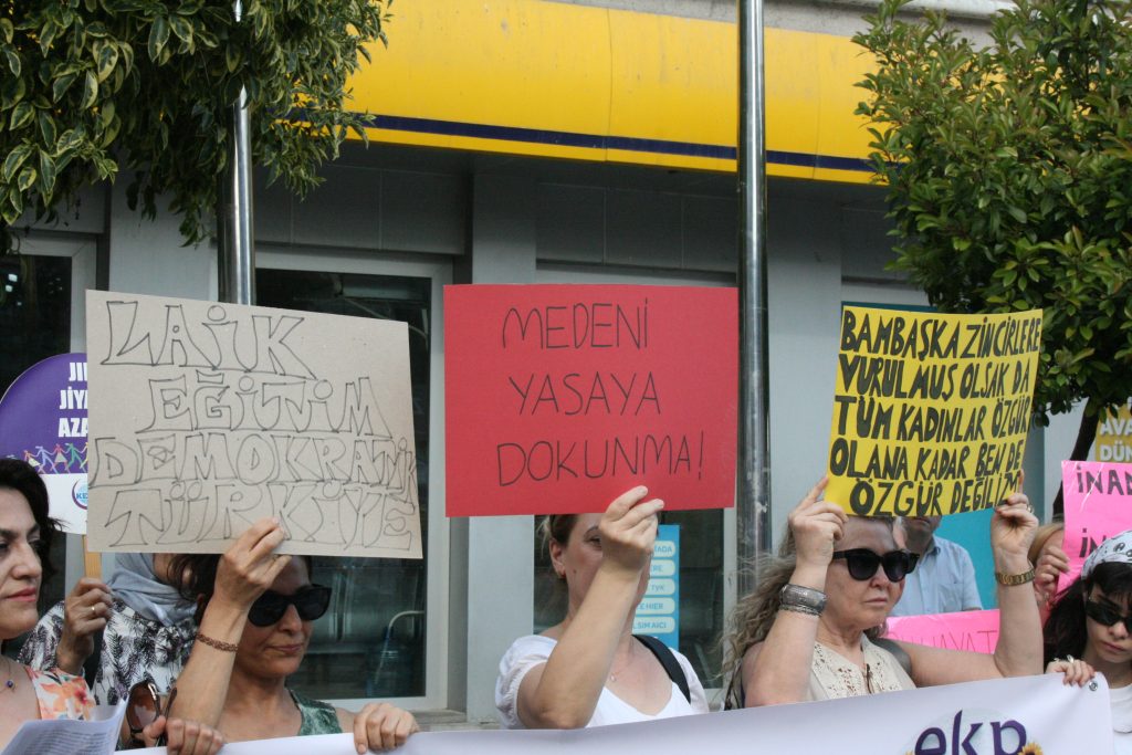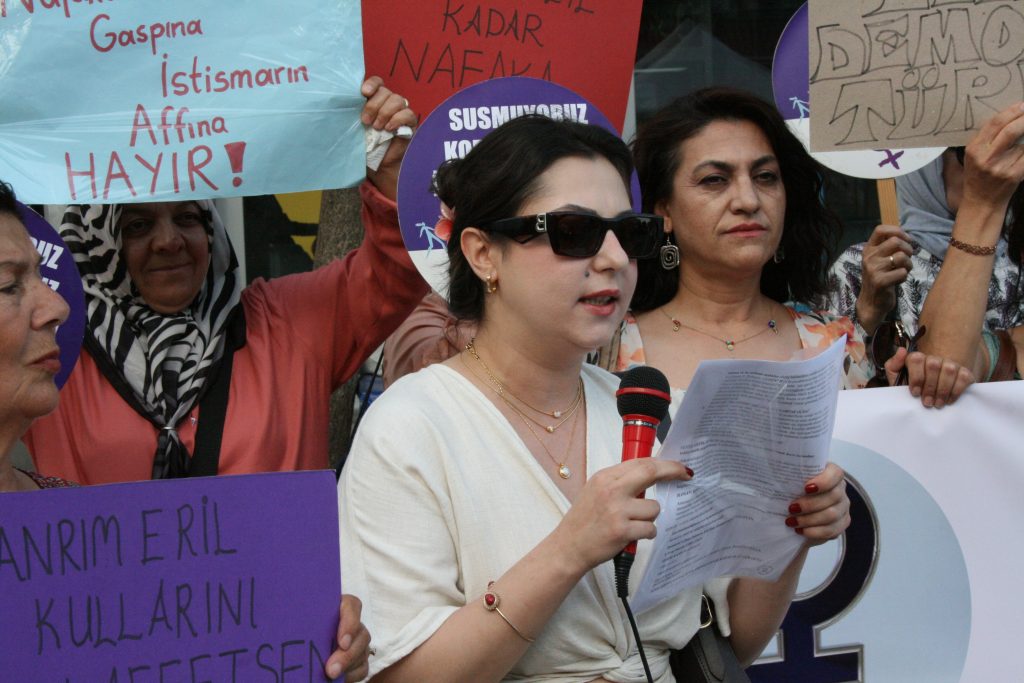 Hukuksuzluğunuzu hukuka uydurma yöntemlerinizi, eşitlik ve laiklik düşmanı politikalarınızı, Meclis’te oybirliği ile kabul edilmiş olan İstanbul Sözleşmesi’nden bir gece yarısı, bir kişinin kararı ile çekilmenizden biliyoruz. Yeni değil, bugün değil, yüzyıllardır iktidarınızı kadınların boyunlarını eğerek var etmeye çalıştınız. Her hakkımızı mücadele ile kazandık. İşte buradayız. Fetvalarınıza, yasaklarınıza boyun eğmiş olsaydık bugün burada olmazdık. Yalanlarınıza, vizyonsuz vizyon belgelerinize, laiklik ve eşitlik karşıtı torba yasalarınıza asla boyun eğmeyeceğiz. Amacınızı ve yöntemlerinizi biliyoruz. Seçilmiş belediye başkanları yerine ‘kayyum’larınızı atamanızdan, muhalif herkesi kumpas ve intikam davaları ile hukuka aykırı olarak hapislerde tutmanızdan biliyoruz. Rant aşkınızdan, imar yasalarınızdan, bilime ve bilimsel eğitime saldırılarınızdan, hayvanlara ve doğaya verdiğiniz zarardan biliyoruz. Hala hukuksuzluğunuza kılıf uydurmaya çalışıyorsunuz ama hatırlatalım; siz kaybettiniz. Demokrasi ve insan haklarını yok etme girişimlerinden vazgeçin. 9. yargı paketini geri çekin” diye konuştu.