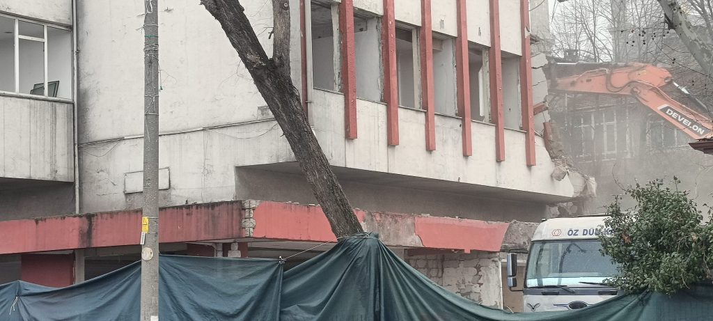 Yıkım öncesinde Orduevi binasının çevresi dün güvenlik çemberine alındı. Yaya ve araç trafiğinin güvenliği göz önünde bulundurularak yıkım çalışmalarının binanın arka kısmından kontrollü bir şekilde yürütüldüğü görüldü.