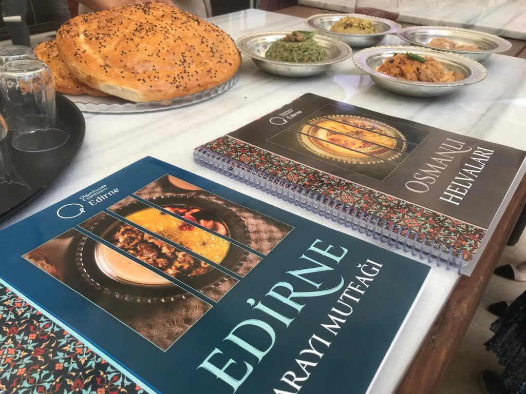 Edirne’nin Rumeli ve Osmanlı dönemlerinden bu zamana kadar olan lezzetleri, Edirne Olgunlaşma Enstitüsü tarafından ‘Edirne Saray Mutfağı’ ve ‘Osmanlı Helvaları’ adlı kitaplarda derlendi. Çoğu tarifin ve yapılışlarının mevcut olduğu kitapların tanıtımı için Deveci Han Kültür Merkezi’nde program gerçekleştirildi. Yapılan programa katılım sağlayan Edirne Valisi Yardımcısı Ercan Çiçek, Edirne İl Kültür Turizm Müdürü Kemal Soytürk, kurum müdürleri ve vatandaşlara saray lezzetlerinden olan Dane-i yeşil, Ballı Mahmudiye, Fodula ekmeği, Helva-i hakani, Sultan helvası ve Gül şerbeti hem tanıtıldı hem de ikram edildi.