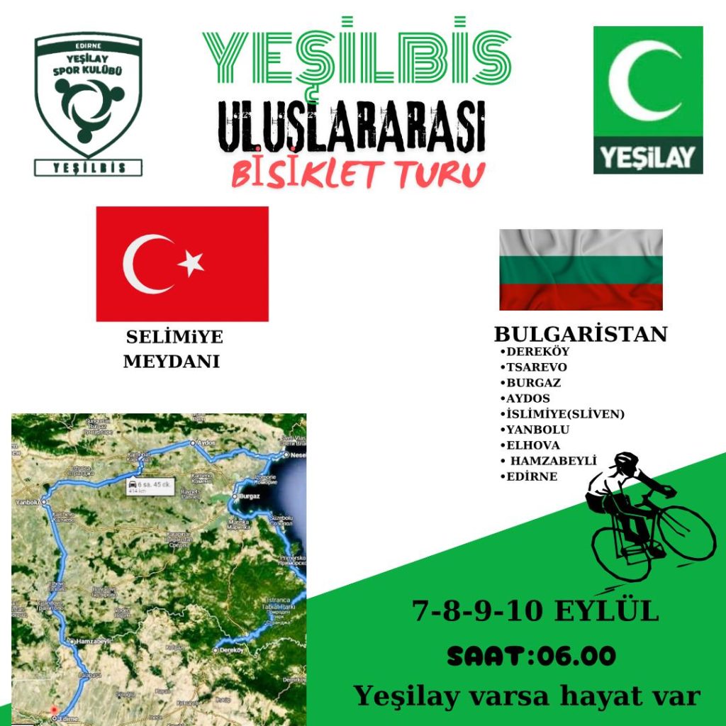 Edirne Yeşilay Spor Kulübü tarafından organize edilen ve YEŞİLBİS (Yeşilay Bisiklet Topluluğu) üyelerinin katılım sağladığı “Uluslararası Bisiklet Turu” 11 Eylül 2024 Çarşamba Günü Hamzabeyli Sınır Kapısından giriş yapılarak Edirne Selimiye Meydanında son bulacak.