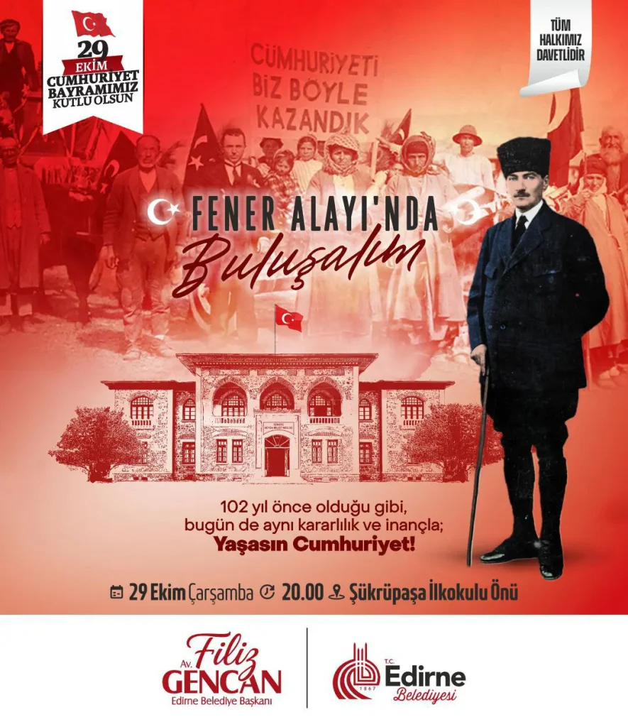 Edirne Belediyesi'nin 29 Ekim Çarşamba günü düzenleyeceği etkinlikler, saat 20.00’de Şükrüpaşa İlkokulu Önü'nden başlayacak Fener Alayı ile start alacak. Binlerce Edirnelinin meşaleler ve bayraklarla katılması beklenen alay, "102 yıl önce olduğu gibi, bugün de aynı kararlılık ve inançla; Yaşasın Cumhuriyet!" sloganıyla yürüyecek.