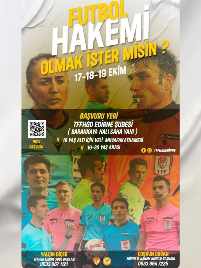 TFFHGD Edirne Şubesi, 17-18-19 Ekim tarihlerinde futbol hakemliği kursu düzenleyecek. 16-26 yaş arası gençlerin katılabileceği kurs için başvurular başladı.
