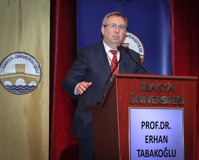 Trakya Üniversitesi Rektörü Prof. Dr. Erhan Tabakoğlu, Trakya Üniversitesi ve Edirne hakkında bilgi paylaşarak başladığı konuşmasında “Biz bu şehrin üniversitesi olarak şehrimizin değerlerini ortaya çıkarmak için Edirne konulu pek çok toplantı gerçekleştirdik.” dedi. Trakya Üniversitesinin 1974’te İstanbul Üniversitesi bünyesinde kurulduğunu ve İstanbul Üniversitesi ile geçmişten gelen derin bağları olduğunu ifade ederek bu sempozyumu beraber düzenlenmekten duyduğu memnuniyeti dile getirdi. Rektör Tabakoğlu “Bu toplantının çok büyük bir ağırlığı var. Tabiri caizse starların bir araya geldiği, hocaların hocalarının buluştuğu bir sempozyum bu. O yüzden bu sempozyumun özgül ağırlığı çok yüksek.” dedi.