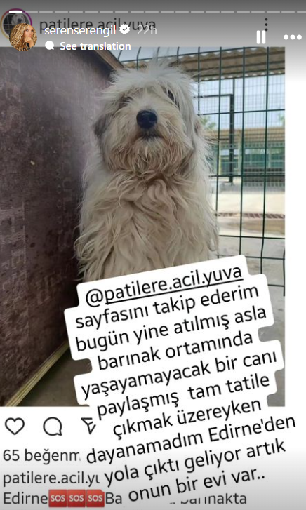 Serengil, sosyal medya hesabından şu açıklamayı yaptı; "Barınak ortamında yaşayamayacak bir canı paylaşmışlar. Tam tatile çıkmak üzereyken dayanamadım. Edirne'den yola çıktı, geliyor. Onun artık bir evi var."