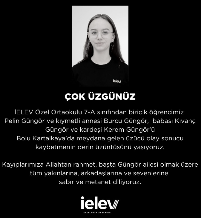 Ailenin kızı Pelin Güngör'ün okulu İstanbul Erkek Liseliler Eğitim Vakfı (İELEV), ortaokul 7-A sınıfı öğrencisi Pelin Güngör için bir taziye mesajı yayınladı.