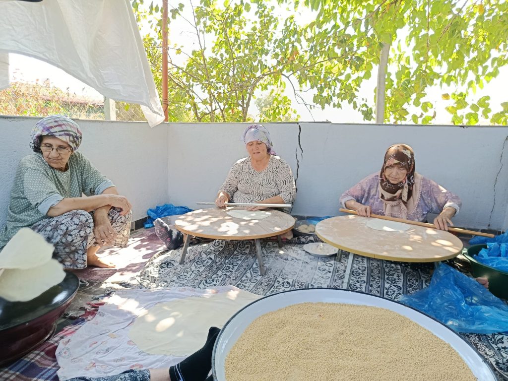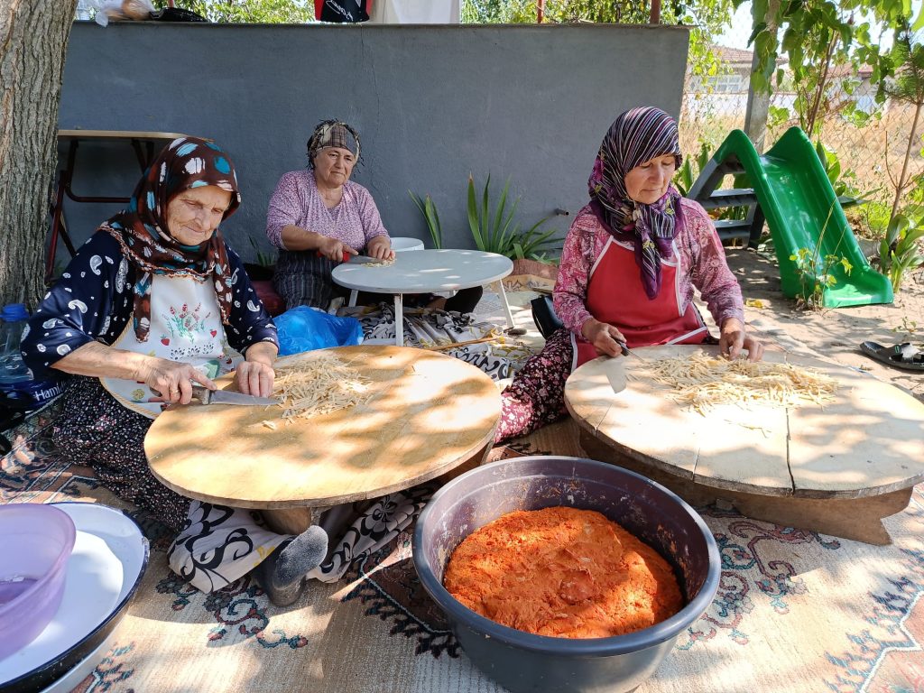 Edirne’de yaz mevsiminin son günlerinde her yıl olduğu gibi kışlık yiyecek hazırlıkları hızlandı. Edirne merkeze bağlı Sazlıdere köyündeki kadılar, her gün farklı hanede bir araya gelerek, imece usulü yardımlaşmayla birbirlerine, her birinin yapımı ciddi bir emek ve tecrübe gerektiren tarhana, yufka, kuskus, erişte makarna ve turşu gibi yiyecekleri hazırlıyorlar.