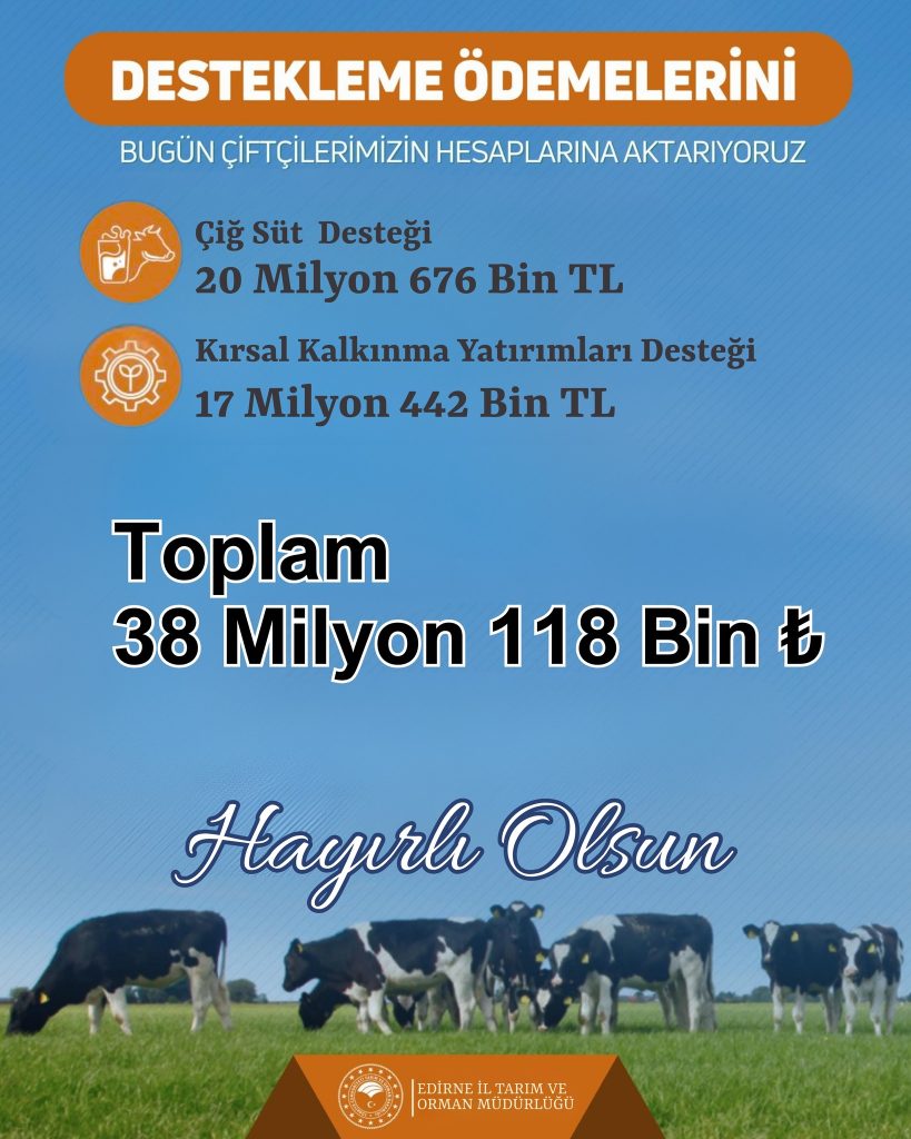 Edirne İl Tarım ve Orman Müdürlüğü tarafından yapılan açıklamaya göre, çiğ süt ve kırsal kalkınma yatırımları kapsamında Edirne’deki üreticilerin hesaplarına toplam 38 milyon 118 bin liralık destek ödemesi aktarıldı.