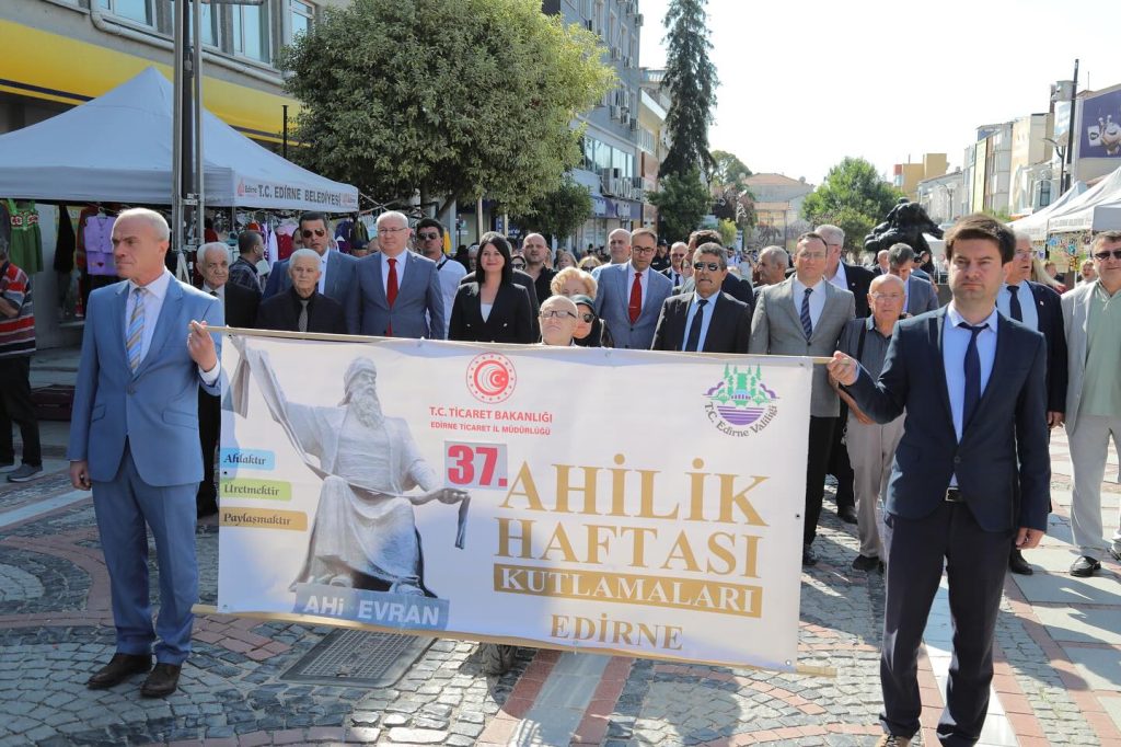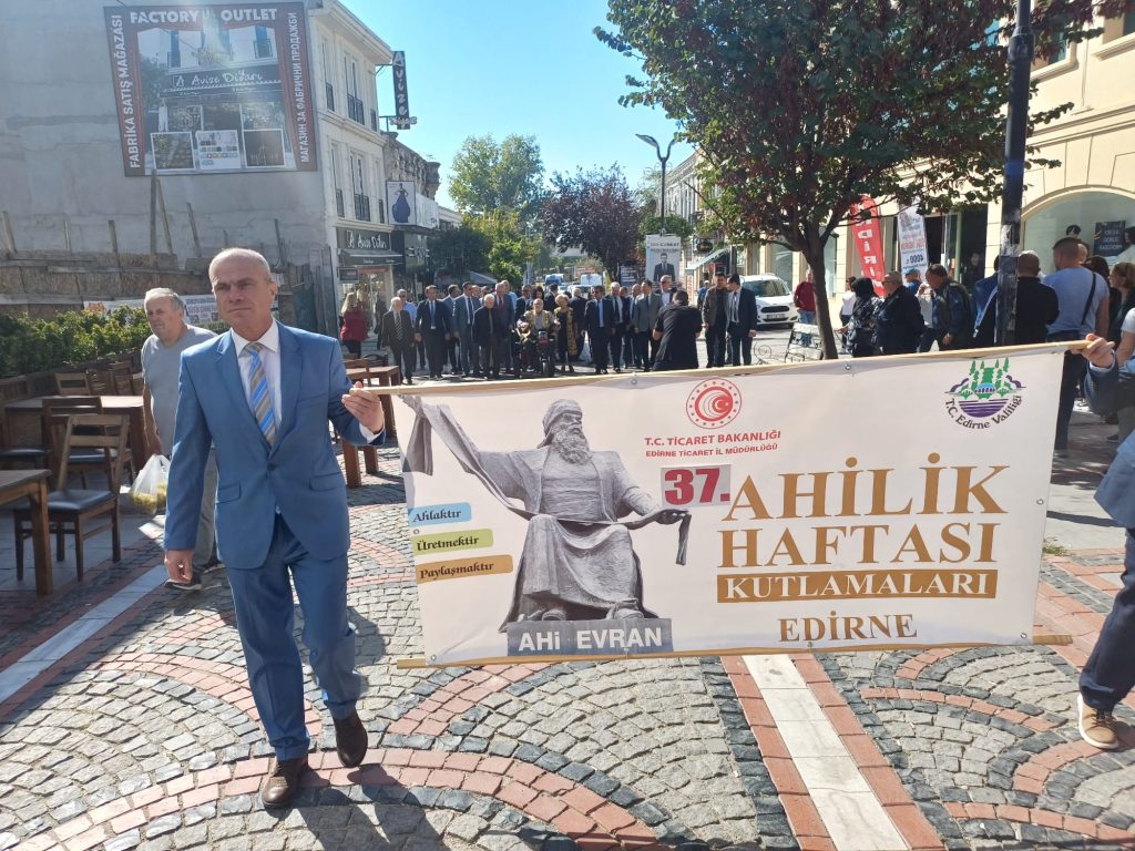 Törenin ardından konuşan Edirne Ticaret İl Müdürü Mahmut Altın, bu yıl ilk kez bir kadın ahi seçtiklerini ifade ederek; “13’üncü yüzyılda ahilik teşkilatı, Ahi Evran tarafından kurulduğunda Fatma Bacı yani Ahi Evran'ın eşi de kadınları örgütlemiş, Kayseri'de kurulan bir sanayi sitesinde bir taraftan Ahi Evran deri işletmeciliğiyle uğraşırken bir taraftan da o derilerden çıkan yünleri kadınlar ayrı bir bölümde işlemişler. Halı dokumuşlar, pamuklu giysiler dokumuşlar, kilim dokumuşlar ve bunları değerlendirmişler. Yani dünyada belki ilk defa kadınların kurdukları bir teşkilat. Ahi Evren 32 sanat teşkilatını bir araya getirmiş o dönemde. Yani bugünkü Esnaf ve Sanatkarlar Teşkilatı'nın ana gövdesi 13’üncü yüzyılda Ahi Evran'ın kurduğu ahi birliklerinden meydana gelmiş. Bugün, modern anlamda da birçok kanun oradan esinlenmiş. İSO kalite belgesi, tüketici kanunu ve birçok kanun da o dönemin kurallarını esas alarak yapılmış. Edirne'de 17 bin 500 civarında esnaf var, 34 tane de oda var birliğe bağlı. Bu esnafın yüzde 21'i kadın. Bu yıl dedik ki; bir kadın ahi de olsun, kadınları temsilen olsun. İnşallah devamı gelecek" şeklinde konuştu.