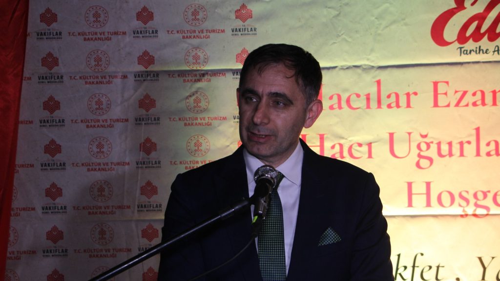 Edirne Vakıflar Bölge Müdürü Ahmet Saraç ise konuşmasında, “Hava şartları nedeniyle programımızı Hacılar Ezanı Namazgâhı’ndan buraya aldık. Uzun süredir unutulmuş bir geleneğin yeniden başlamasının mutluluğunu yaşıyoruz. Bu yıl ikinci kez hacılarımızı uğurluyoruz. Vakfiye şartlarını yerine getirmenin huzurunu yaşıyoruz. Hacı adaylarımızdan ricamız; Edirne’nin selamını Kabe’ye götürün, vakıf ecdadımıza dualarınızı eksik etmeyin” dedi.