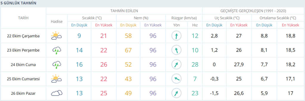 25 Ekim Cumartesi; parçalı bulutlu, hava sıcaklığı en düşük 13, en yüksek 22 derece.