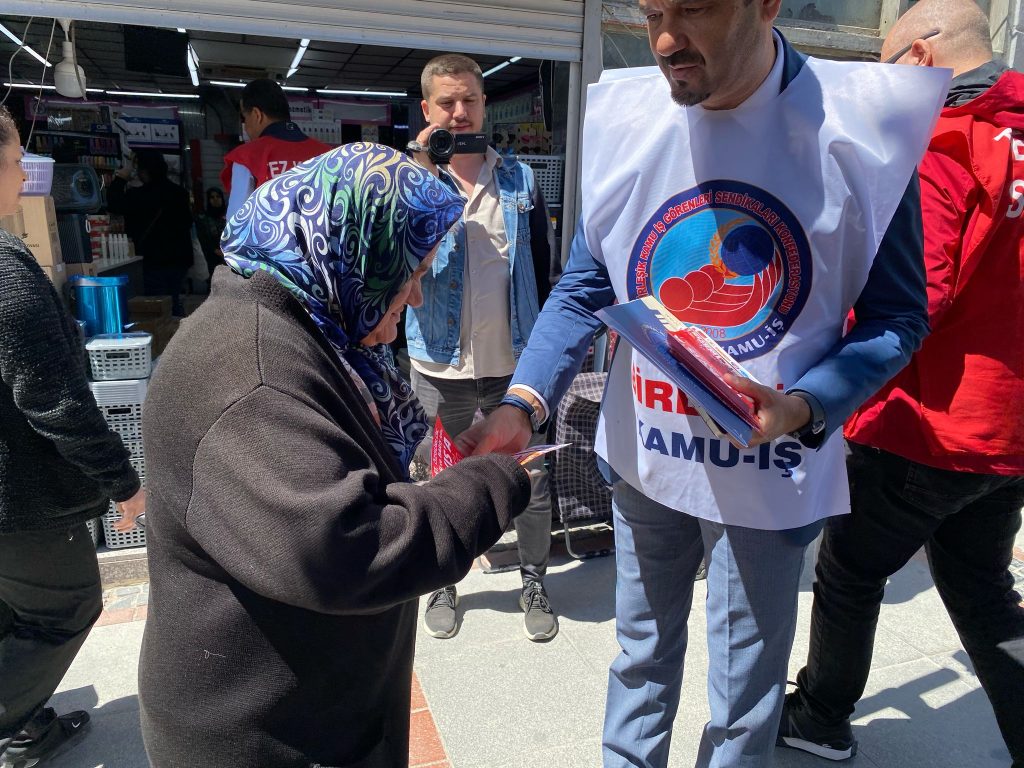 Konuşmanın devamında platform temsilcileri Saraçlar Caddesi’nde vatandaşlara, 1 Mayıs’a davetle ilgili mesajlar bulunan broşürler verdi.