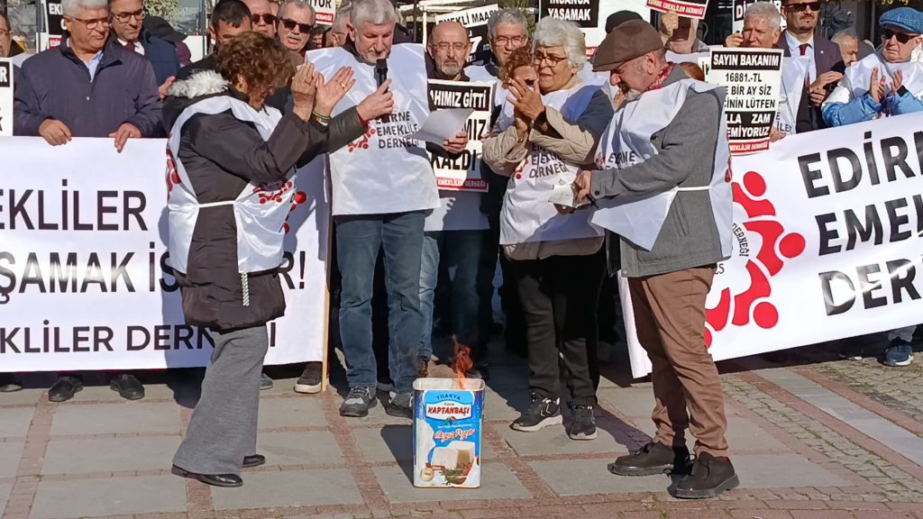 Saraçlar Caddesi’nde gerçekleştirilen basın açıklamasına çok sayıda emekli katılırken, siyasi parti ve sivil toplum kuruluşlarının temsilcileri de emeklilere destek verdi. Açıklamaya katılan emekliler, artan hayat pahalılığı nedeniyle ödeyemediklerini belirttikleri faturaları yakarak tepkilerini gösterdi. Basın açıklamasını Edirne Emekliler Derneği Başkanı Ahmet Ziya Yaz okudu.