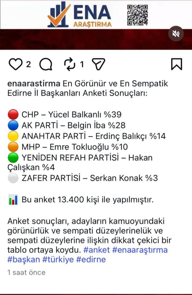 ENA Araştırma’dan Edirne’de: “En Görünür ve En Sempatik İl Başkanları”