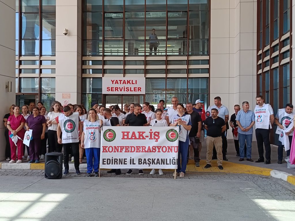 Edirne’de HAK-İŞ Konfederasyonu’na bağlı Öz Sağlık-İş çalışanları, Pençe-Kilit Harekâtı bölgesinde şehit olan 12 askerimizi anmak için Sultan 1’inci Murat Devlet Hastanesi önünde toplandı. HAK-İŞ Edirne İl Başkanlığı öncülüğünde düzenlenen etkinlikte, Türkiye genelindeki anma programlarına destek verildi. Şehit haberlerinin ardından kamu işçilerine yönelik eylemler ertelenirken, 81 ilde işyerleri önünde dua, saygı duruşu, İstiklal Marşı ve Kur’an-ı Kerim tilavetleriyle şehitler anıldı. Etkinlik sonunda vatandaşlara lokma ikramı yapıldı.
