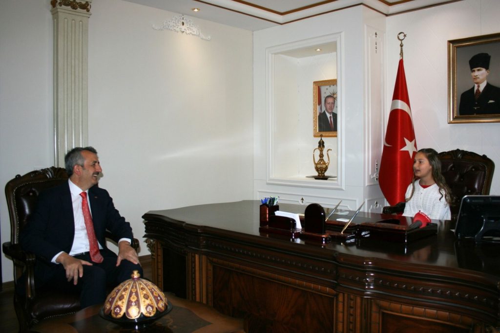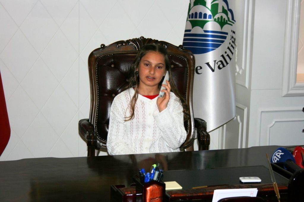 İstiklal Ortaokulu öğrencileri Tuana Aslan, Belinay Salman ve Uras Önal’ı makamında kabul eden Edirne Valisi Yunus Sezer, 5’inci sınıf öğrencisi Tuana Aslan’a bir günlüğüne makamını devretti. Makama geçen Tuana, ilk talimatını Edirne İl Emniyet Müdürü Onur Karaburun’a verdi. Çocuk Vali Tuana, okul önlerine yaya geçidi ve okul çıkışlarında polis görevlendirilmesi yönünde Karaburun’a talimat verdi.