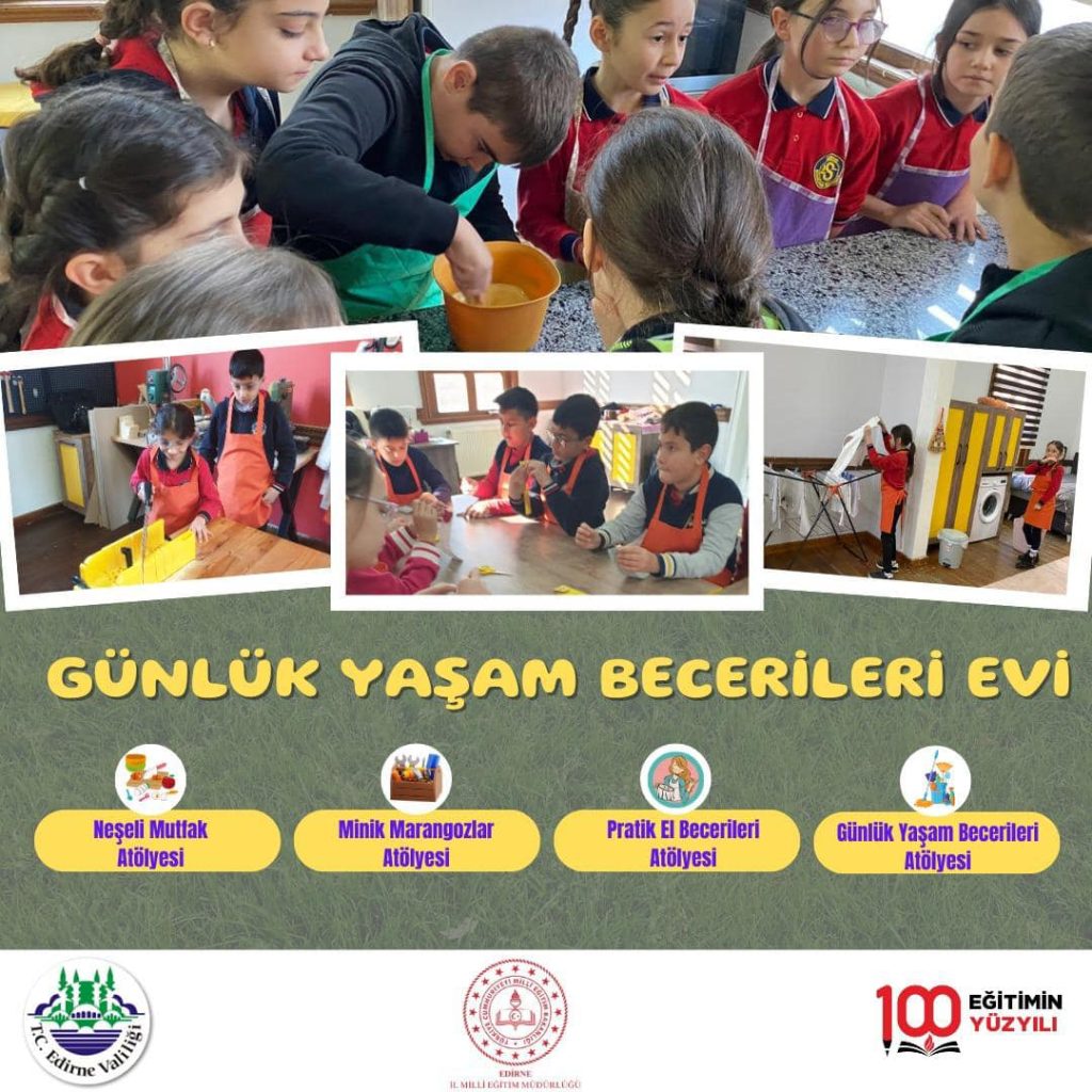 Edirne Valiliği tarafından 2024-2025 eğitim-öğretim yılının ilk döneminde başlatılan “Küçük Ustalar Hayatı Öğreniyor” projesi kapsamında kurulan neşeli mutfak, pratik el becerileri, günlük yaşam becerileri, minik marangoz atölyelerinde Tüm İlk ve Ortaokul öğrencileri, günlük yaşam becerilerini (yaşam alanını temizleme ve toplama, yemek hazırlama, sofra düzeni kurma, dikiş yapma, ütü ve ev işlerinde destek olma deneyimi, marangoz atölyesi eğitimi) deneyimleyeme imkanı buluyor.
