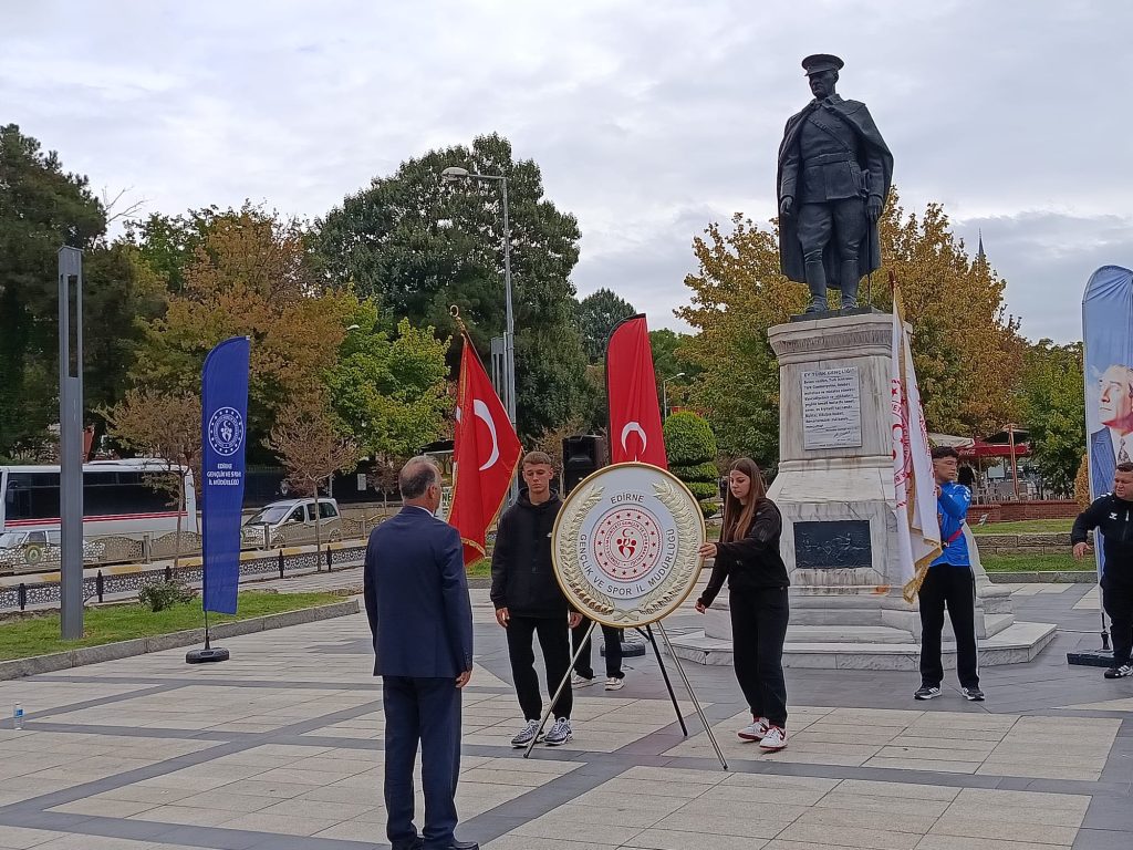 Atatürk Anıtı’nda düzenlenen çelenk sunma törenine, Edirne Gençlik ve Spor İl Müdürü Selim Ak, Edirne Amatör Spor Kulüpleri Federasyonu (ASKF) Başkanı Muzaffer Yıldırım, Gençlik ve Spor Şube Müdürleri, antrenörler, öğrenciler ve çok sayıda sporcu katıldı.