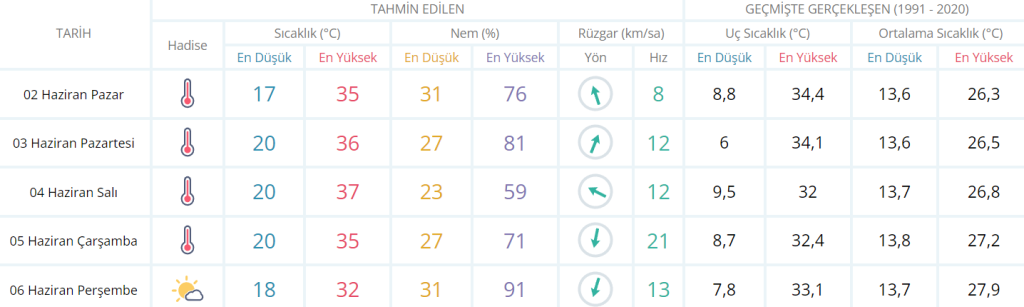 2 Haziran Pazar en düşük 17, en yüksek 35 derece. 3 Haziran Pazartesi en düşük 20, en yüksek 36 derece. 4 Haziran Salı en düşük 20, en yüksek 37 derece. 5 Haziran Çarşamba en düşük 20, en yüksek 35 derece. 6 Haziran Perşembe en düşük 18, en yüksek 32 derece.