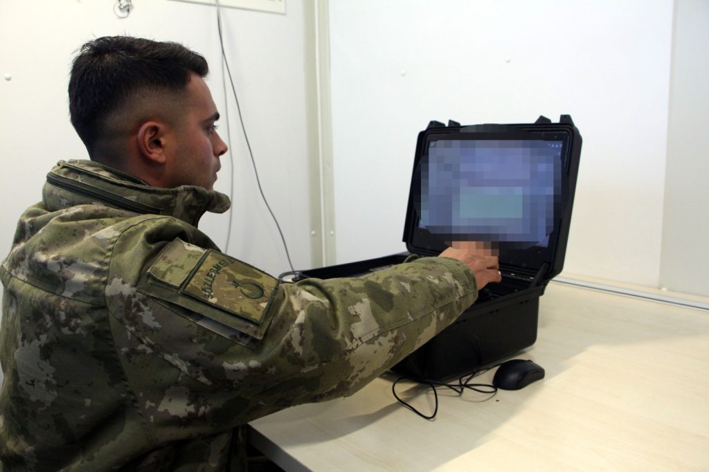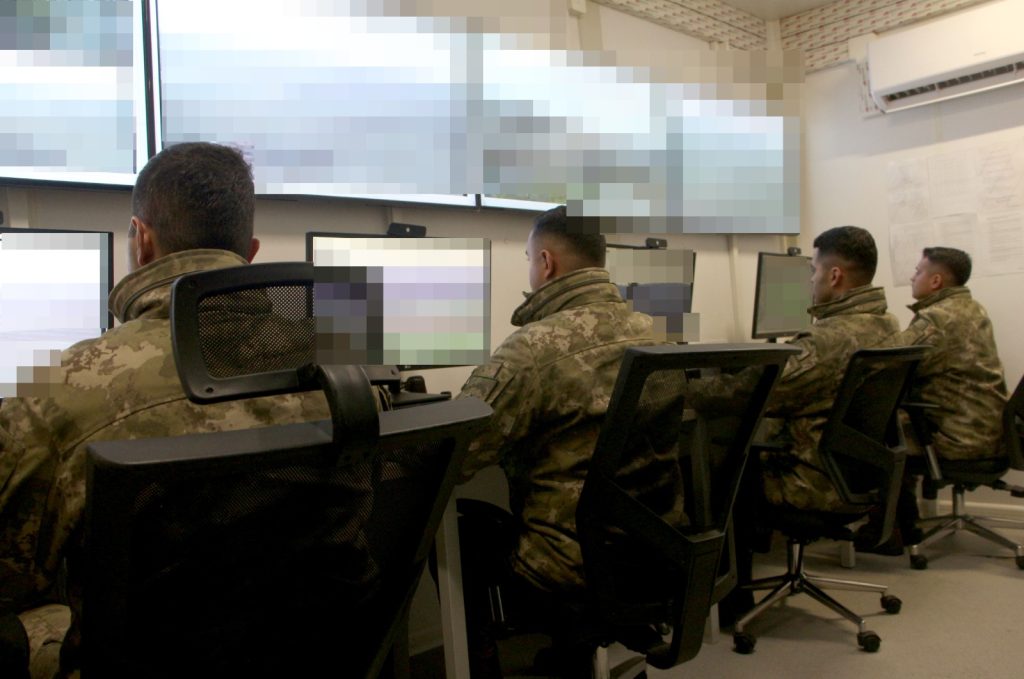 Kaya, birlikte bulunan dronlar sayesinde hudut hattının geniş açılardan gözetleme imkanı sağlandığını söyleyerek; "Devriye köpek timlerimizle araziyi daha detaylı incelemekteyiz. Elektro optik kuleler, hudut hattında ve karakollarda konuşlu haberleşme ve gözetleme kuleleridir. Kulenin en üst kısmında bulunan termal kamera sistemi, her türlü dış ortamda, 7 gün 24 saat 360 derece panoramik keşif gözetleme imkanı sağlar. Üzerinde bulunan lazermetre ile mesafe ölçümü yapmamızı sağlarken yer konumlama alıcısı ile tehdidin konumunu belirlemekteyiz. Orta kısmında hareket tespit radarımız bulunmaktadır. Radarımız gece ve gündüz her türlü hava koşulunda karada hareket eden hedefleri tespit, takip ve sınıflandırma görevini yerine getirmektedir. Alt kısımda bulunan atış yer tespit sistemimiz sayesinde her türlü hava muhalefetinde kullanıcısına, saniyeler içerisinde atışın yapıldığı noktayı sesli ve görsel olarak bildirmektedir. Hudut hattında bulunan elektro optik kuleler, alınan görüntüyü sistem odası marifetiyle görüntü izleme merkezine aktarmaktadır. Görmüş olduğunuz ekranlara görüntüler anlık olarak aktarılarak operatörlerimiz tarafından izlenir ve değerlendirilir" şeklinde konuştu.