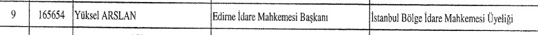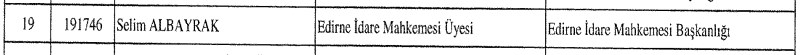 Hakimler ve Savcılar Kurulunun (HSK) atama kararnamesi Resmi Gazetede yayınlandı. Edirne İdare Mahkemesi Başkanı Yüksel Arslan İstanbul Bölge İdare Mahkemesi üyeliğine getirildi. Edirne İdare Mahkemesi Başkanlığı görevine ise Edirne İdare Mahkemesi Üyesi Selim Albayrak atandı.
