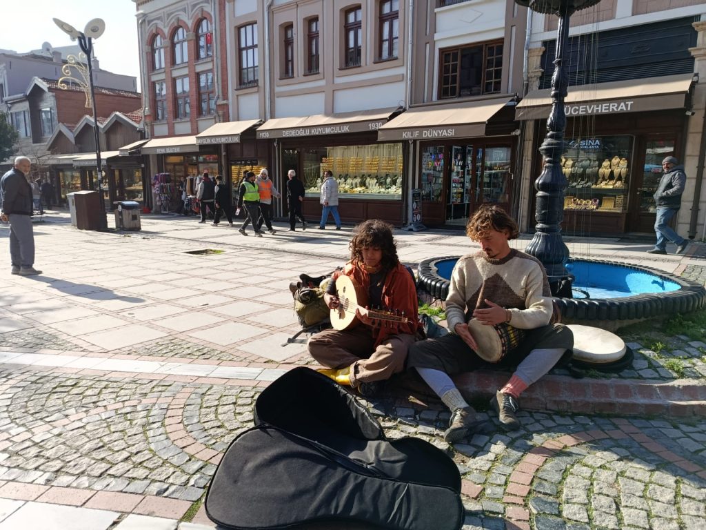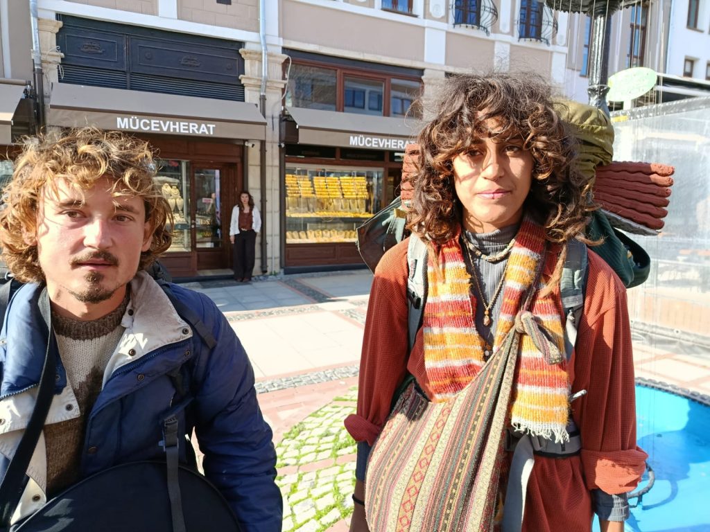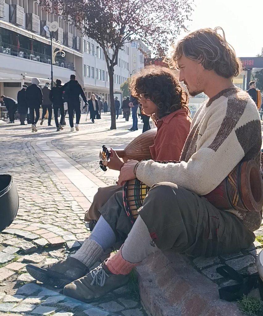 Balkan turuna çıkan iki gezgin arkadaş, yolculukları sırasında uğradıkları Edirne’de Saraçlar Caddesi’nde sokak müziği yaptı. Hollandalı Naomi (25) ile Kuzey Makedonyalı Martin (27), otostopla ilerledikleri seyahatlerinde ihtiyaçlarını müzik yaparak karşılıyor. Ud, toprak darbuka ve tef ile geleneksel ezgiler seslendiren genç müzisyenler, cadde boyunca yürüyenlerin ilgisini çekti.