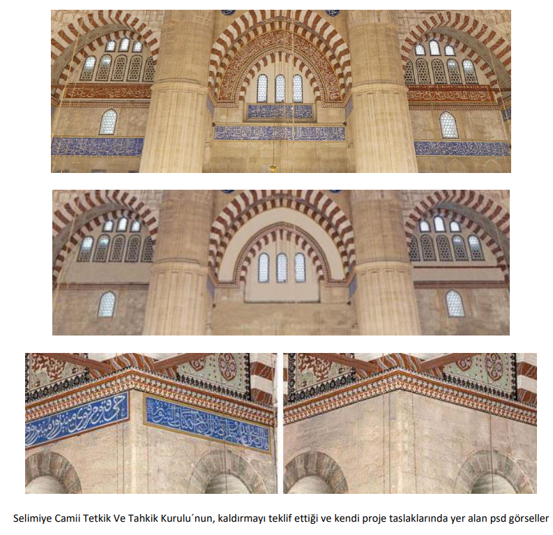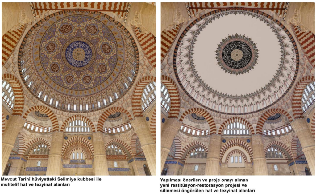 “Edirne Selimiye Camii’nin restorasyonunda yapılan kalemişi ve süslemeler bilimsel verilere dayanarak 2024’de tamamlanmıştır, ancak “Selimiye Camii Tetkik ve Tahkik Heyeti” adı altında Fatih Sultan Mehmet Vakıf Üniversitesi’nden yetkilendirme yazısı alarak 16. yüzyıla dönüş iddiasıyla ana kubbedeki mevcut 18. Yüzyıl tezyinatın sökülmesi üzerine yeni bir restitüsyon projesi önerilmesi ve bu projenin koruma kurulu tarafından defalarca reddedildiği halde en sonunda kabul edilmesi(!) UNESCO süreci ve kamu yararı açısından da risk taşımaktadır. Mimar Sinan camilerinde zamanla çeşitli dönemlerde onarımlar ve eklemeler olmuştur. Bu çok katmanlılık, kültürel mirasın zenginliğidir. Tarihi yapılar yalnızca mimari değil, aynı zamanda çok katmanlı kültürel belgeler olup yerinde (in situ) korunmuş her kalem işi, her iz, yapının geçirdiği tarihsel süreçlerin tanığıdır. Restorasyon uygulamaları bu katmanları yok etmek değil, belgelemek ve gelecek kuşaklara aktaracak biçimde yaşatmakla yükümlüdür. Kurul kararları, restitüsyon belgeleri, koruma kuramı ve UNESCO yükümlülükleri bağlamında mimari mirasa müdahale sınırları yeniden düşünülmelidir.”
