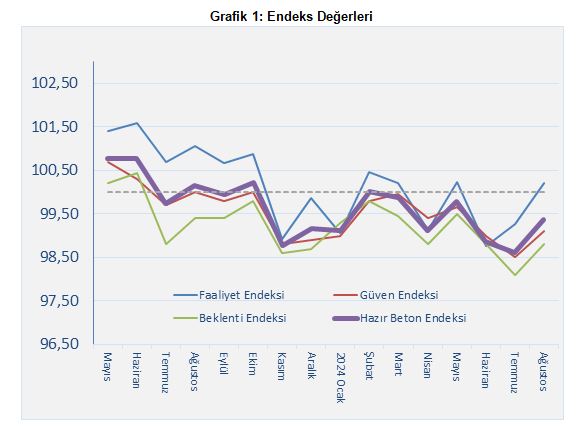 Hazır Beton Endeksi 2024 Ağustos Ayı Raporu’na göre, Faaliyet Endeksi oldukça düşük seviyelere indikten sonra ağustos ayında eşik değerin hemen üzerine çıkmayı başarmış görünüyor. Beklenti ve Güven endeksleri de yükseldi, ancak hâlen eşik değerin altında yer aldı. Her 3 endeksteki yükseliş sonrasında Hazır Beton Endeksi de artmış olmakla birlikte Beklenti ve Güven Endekslerinin düşük seyretmesi nedeniyle Beton Endeksi eşik değerin altında seyrediyor.