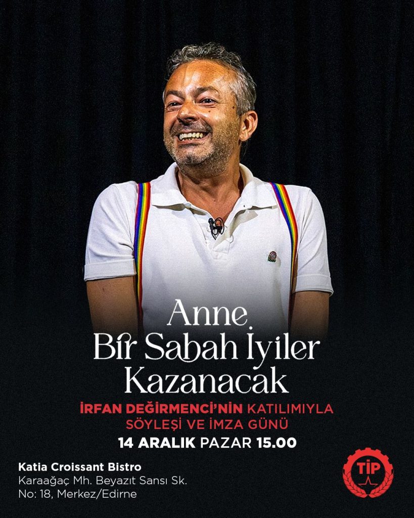 Türkiye İşçi Partisi (TİP) Edirne İl Başkanı Betül Okuyan, 14 Aralık Pazar günü İrfan Değirmenci’nin katılımıyla Karaağaç Mahallesi'nde söyleşi ve imza etkinliği düzenlediklerini açıkladı. Söyleşide Değirmenci'nin son kitabı “Anne Bir Sabah İyiler Kazanacak” üzerinden toplumsal ve bireysel mücadele konuşulacak.