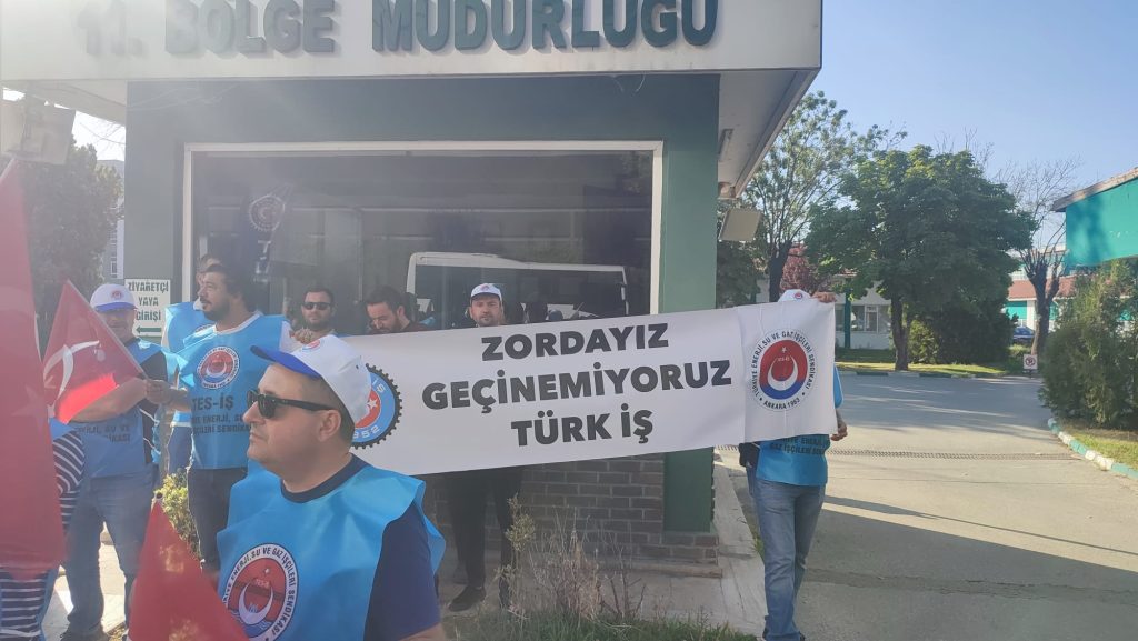 Toplu İş Sözleşme sürecine dair beklenti ve taleplerini dile getirmek amacıyla bu sabah DSİ 11'inci Bölge Müdürlüğü önünde basın açıklaması gerçekleştiren TÜRK-İŞ’e bağlı TES-İŞ Sendikası Edirne Şubesi üyeleri, iktidarın işçiyi oyaladığını ifade ederek adil bir teklif sunmadığını belirttiler. TÜRK-İŞ Edirne Şube Başkanı Zeki Şişko; "Maaşlarımızla bir ayı değil, bir haftayı bile çıkaramıyoruz. Kiralar uçmuş, faturalar gelirken ellerimiz titriyor. Uykularımız kaçıyor. Çocuklarımızın beslenmesini, kitap defter masrafını karşılayamıyoruz. Hazine ve Maliye Bakanı, kulaklarını tıkamış, halktan, emekçiden kopmuş, bildiğini okuyor" dedi.