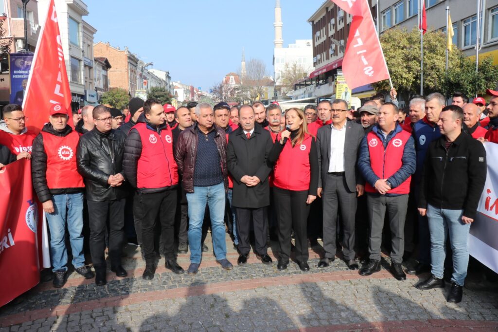 Asgari ücret görüşmelerinin başladığı bu günlerde Türkiye Devrimci İşçi Sendikaları Konfederasyonu (DİSK) düzenledikleri eylemlerle meydanlardan taleplerini duyurmaya devam ediyor. Edirne’de dün Saraçlar Caddesi PTT binası önünde bir araya gelen DİSK üyeleri, hep bir ağızdan ‘gelirde adalet, vergide adalet’ sloganları attılar. Düzenlenen eyleme katılan ve basın açıklaması yapan DİSK Genel Başkanı Arzu Çerkezoğlu; “Bugün Edirne’den yaktığımız bu ateş, yarın Kırşehir, daha sonra sırasıyla Mersin, Antalya, İzmir, Artvin, Eskişehir, İzmit, Bursa ve İstanbul olmak üzere ülkemizin dört bir yanında devam edecek ve taleplerimiz yerine gelene kadar alanlarda, meydanlarda olmaya devam edeceğiz. Edirne’den başlayan bu mücadele, Edirne’den Artvin’e, Kırşehir’den Mersin’e, Adana’dan İstanbul’a Ankara’ya kadar, tüm Türkiye’de bütün işçi arkadaşlarımızla, tüm çalışanlarımızla, tüm emeklilerle, tüm emekçilerle bütün halkımızla buluşarak büyüyecek” diyerek eylemlere devam edeceklerini söyledi.
