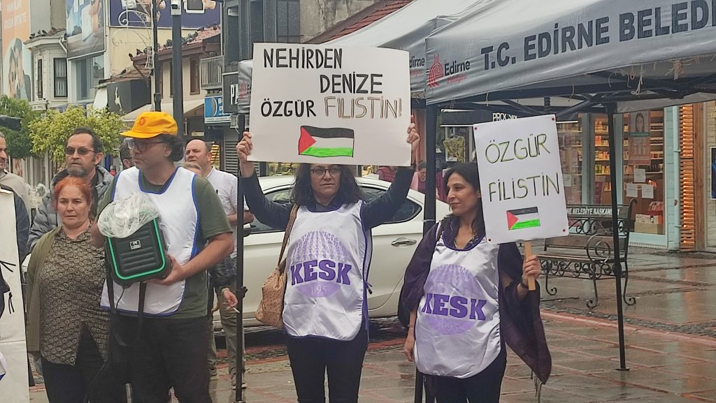 Kamu Emekçileri Sendikaları Konfederasyonu (KESK) tarafından İsrail'in Refah Kampı'nda Filistinlilere yönelik yaptığı saldırıyı protesto etme amacıyla eylem düzenlendi. Saraçlar Caddesi'nde yapılan eylemde açıklamayı yapan KESK’e bağlı Eğitim-Sen Edirne Şube Başkanı Ahmet Acet, Refah saldırısının Uluslararası Adalet Divanı'nın İsrail Ordusu'nun Refah bölgesindeki operasyonlarını durdurma kararı vermesinden kısa bir süre sonra gerçekleştiğine dikkat çekti.