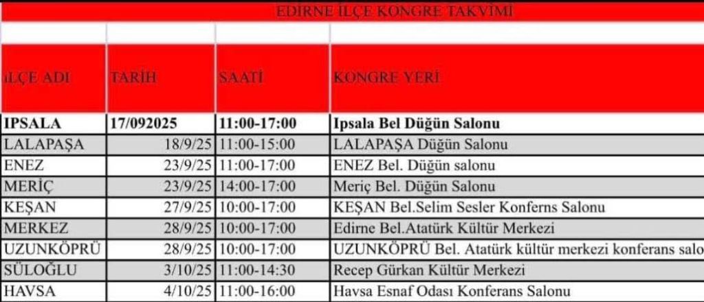 Kongre takviminin son durakları Ekim ayında yapılacak. 3 Ekim’de Süloğlu’nda Recep Gürkan Kültür Merkezi’nde 11.00-14.30 arasında kongre yapılacak. 4 Ekim’de ise Havsa Esnaf Odası Konferans Salonu’nda 11.00-16.00 saatleri arasında düzenlenecek kongre ile Edirne’deki ilçe kongre süreci tamamlanacak.