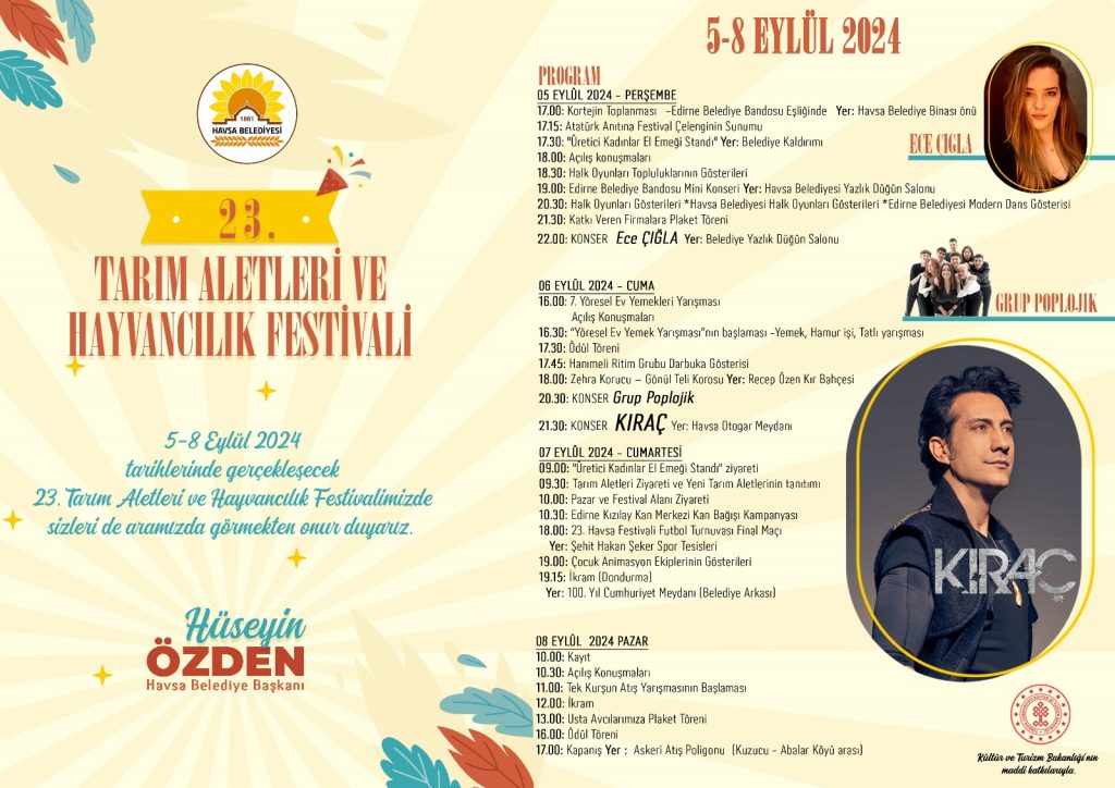 Havsa 23. Tarım Aletleri ve Hayvancılık Festivali'nin programı belli oldu. 5 Eylül Perşembe günü başlayacak olan festival, 4 gün boyunca çeşitli gösteriler, yarışmalar ve konserlere sahne olacak. Türkçe Rock müziğin önde gelen ismi Kıraç, 6 Eylül Cuma saat 21.30'da Havsa Otogar Meydanı'nda sahne alacak. Havsa Belediye Başkanı Hüseyin Özden, tüm vatandaşları festivale davet etti.