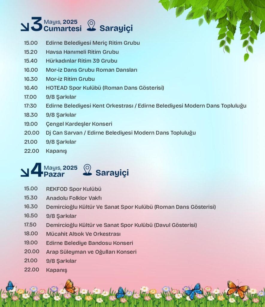 4 Mayıs Pazar günü etkinlikler saat: 15.00’te başlayacak; Rekfod, Anadolu Folklor Vakfı, Çengel Kardeşler, Mücahit Altıok ve Orkestrası, Edirne Belediyesi Bandosu gibi pek çok grup sahne alırken; yerel sanatçılar ve 9/8’lik ritimlerle Edirne bir kez daha dans edecek. Demircioğlu Kültür ve Sanat Spor Kulübü, tarafından roman dans gösterisi ve davul gösterisi yapılacak.