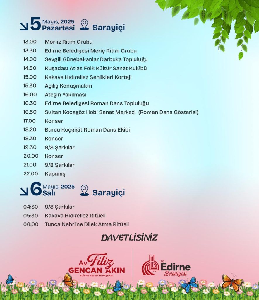 Bu yıl 3-6 Mayıs tarihlerinde Edirne'de kutlanacak olan Kakava ve Hıdrellez şenlikleri kapsamında, Edirne Belediyesi tarafından etkinlikler düzenlenecek. 3 Mayıs Cumartesi günü saat: 15.00’te Tarihi Kırkpınar Güreşleri’nin yapıldığı Sarayiçi’nde başlayacak programda Meriç’ten Havsa’ya, Mor-İz’den Hürkadınlar’a kadar birçok ritim grubu, HOTEAD Spor Kulübü ve Edirne Belediyesi Modern Dans Topluluğu roman dans gösterisiyle sahne alacak. Gösteriler, DJ Can Sarvan ve Edirne Belediyesi Kent Orkestrası performanslarıyla devam edecek. Gecenin finali, 9/8’lik şarkılar ve konserlerle yapılacak.