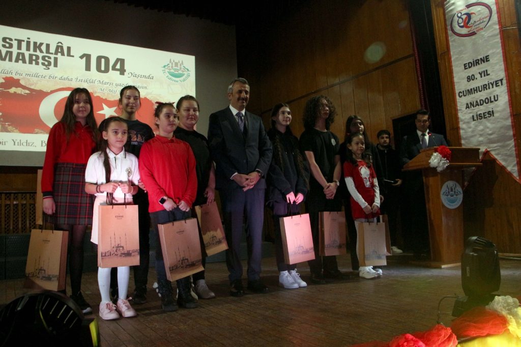 Konuşmaların ardından İstiklal Marşı'nın kabulü dolayısıyla Edirne İl Milli Eğitim Müdürlüğü tarafından düzenlenen, İstiklal Marşı'nı güzel okuma, şiir ve kompozisyon dallarında dereceye giren öğrencilere ödülleri takdim edildi. İl genelinde İstiklal Marşı'nı güzel okuma yarışması birincisi olan Yüksel Yeşil İlkokulu Öğrencisi Zeynep Sevde Soyak, sahnede yeniden sergilediği performans izleyenlerin büyük beğenisini toplayarak alkış aldı. Törende ayrıca, 80'inci Yıl Cumhuriyet Anadolu Lisesi öğrencilerinin hazırladığı oratoryo gösterisi de sunuldu.