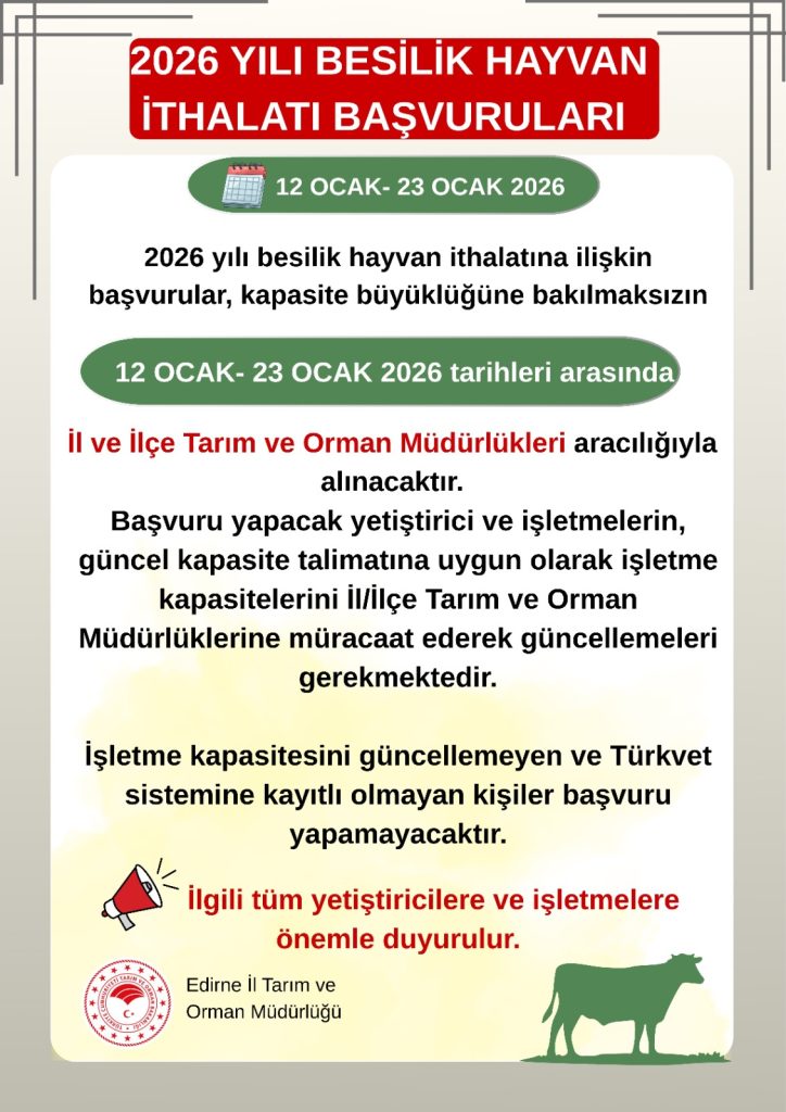 Edirne İl Tarım ve Orman Müdürlüğü, 2026 yılı besilik hayvan ithalatı başvurularının 12–23 Ocak 2026 tarihleri arasında il ve ilçe müdürlükleri aracılığıyla alınacağını duyurdu. İşletme kapasitesini güncellemeyen ve Türkvet sistemine kayıtlı olmayanların başvuru yapamayacağı bildirildi.