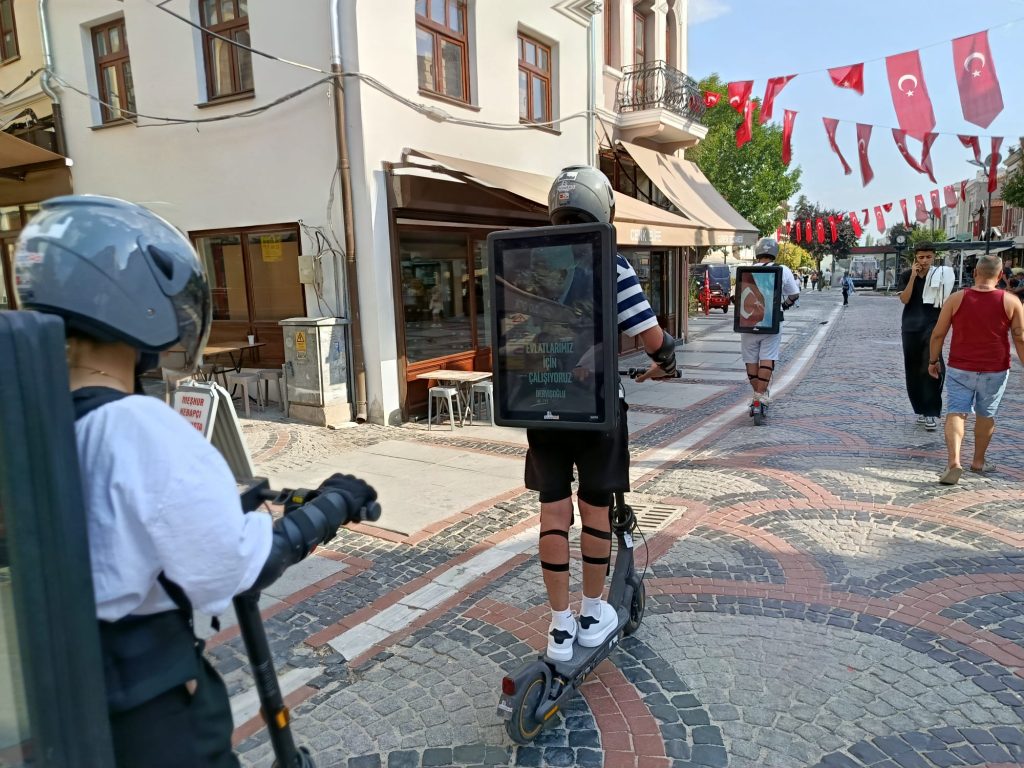 Scooter sürücüsü gençlerin çanta olarak sırtlandığı taşınabilir ekranlar aracılığıyla vatandaşlara parti mesajları iletilirken, yeni nesil tanıtım formatı özellikle gençlerin dikkatini çekti. Çalışmayı gören vatandaşlar, farklı tarzıyla öne çıkan kampanyaya ilgi gösterdi.