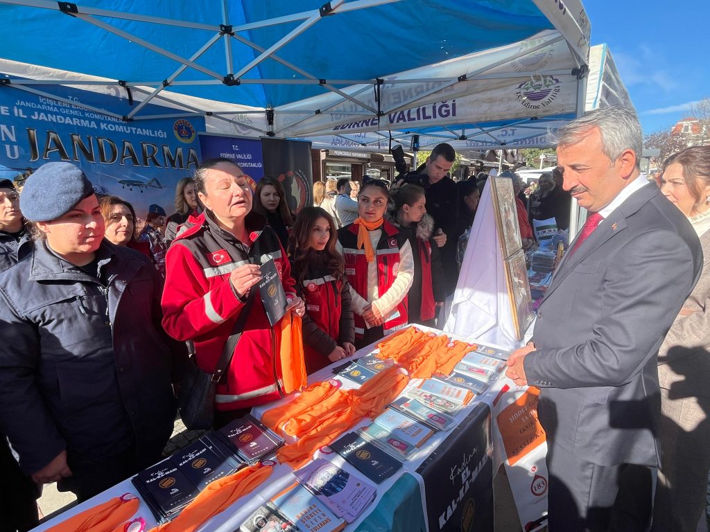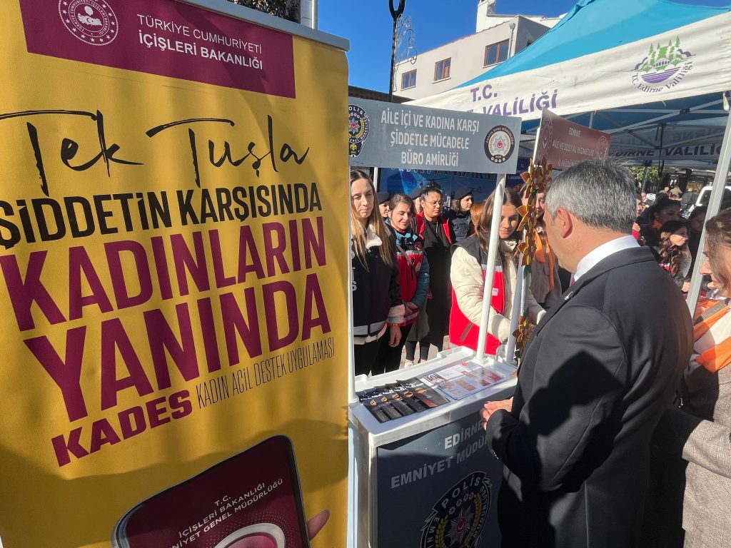Edirne'nin trafiğe kapalı Saraçlar Caddesi'nde, 25 Kasım Kadına Karşı Şiddetle Mücadele Günü kapsamında Aile ve Sosyal Hizmetler İl Müdürlüğü öncülüğünde, Edirne İl Emniyet Müdürlüğü ve İl Jandarma Komutanlığı'nın ortaklığıyla stant açıldı.
